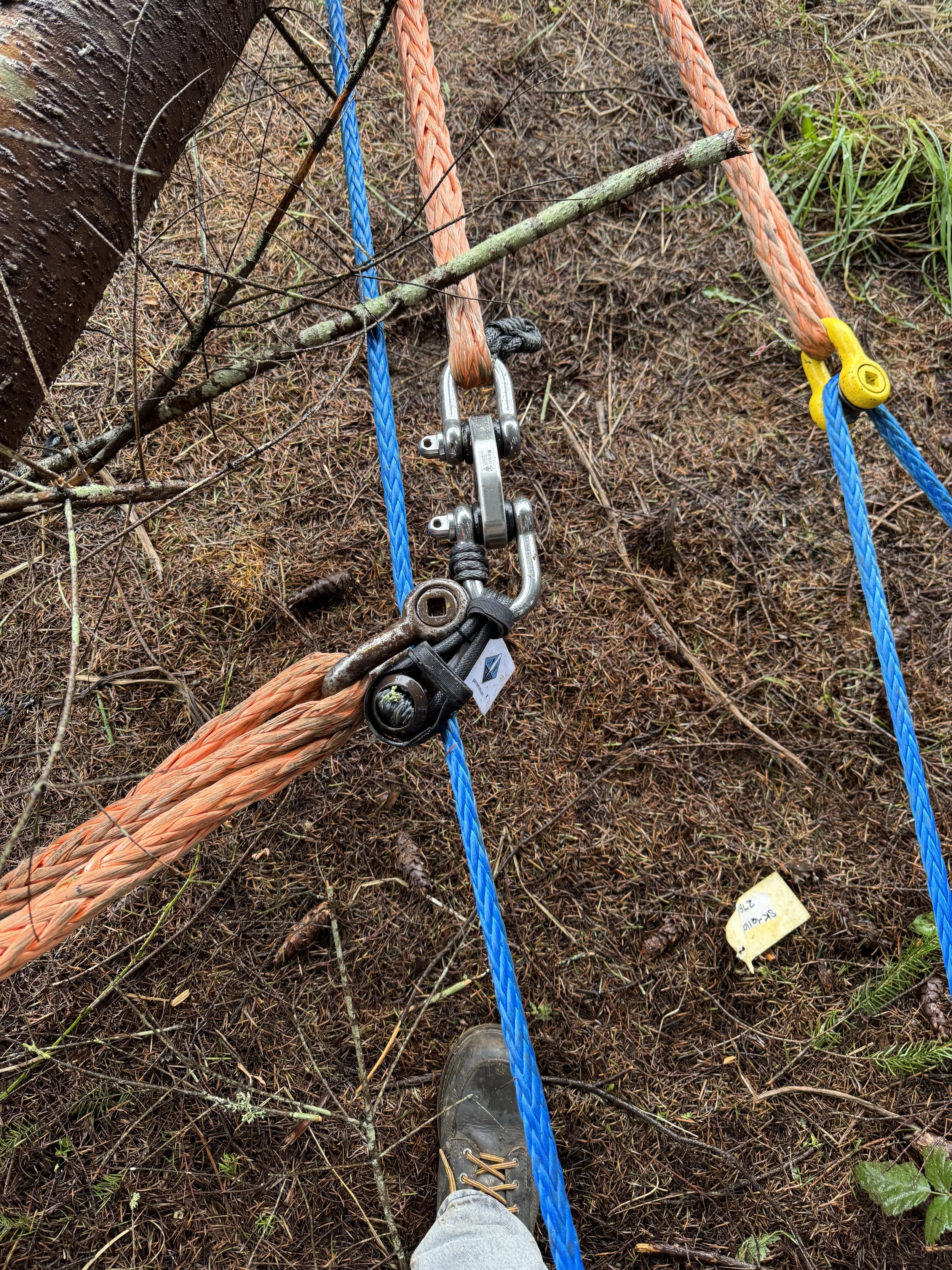 Load cell and synthetic connector in a multi-stump anchor system for Bighorn Logging trial